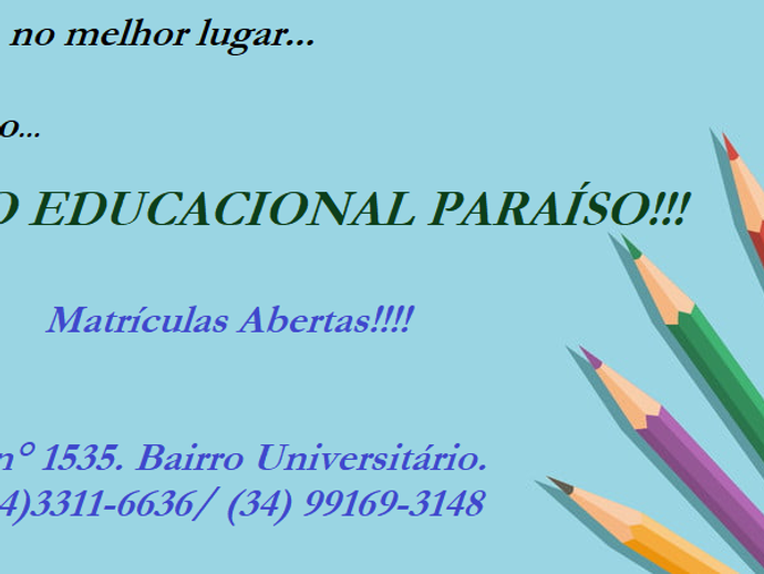 educacionalparaiso1 de dez. de 20201 min de leituraMatrículas abertas!!!Venha nos fazer uma visita!!! Siga-nos no Instagram: @centroeducacionalparaiso